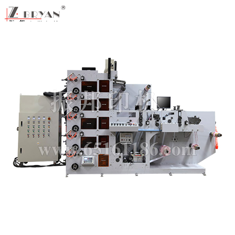 從筒料供紙、印刷、上光、自動(dòng)紅外烘干、覆膜、模切、收卷一次完成。各印刷廠印刷商業(yè)標(biāo)據(jù)、高檔不干膠商標(biāo)**理想的機(jī)型。承印物經(jīng)傳送裝置進(jìn)入采用上、中、下配置的印刷機(jī)組,同時(shí)墨斗輥在墨斗內(nèi)轉(zhuǎn)動(dòng)將油墨傳給網(wǎng)紋傳墨輥,網(wǎng)紋輥的左上方或右下方的刮墨刀刮去網(wǎng)紋輥網(wǎng)墻上的油墨,網(wǎng)紋輥上凹下的墨穴內(nèi)的油墨則傳給印版滾筒,然后在印版滾筒與壓印滾筒之間完成油墨轉(zhuǎn)移,**后經(jīng)過(guò)收紙裝置進(jìn)去成印刷品。